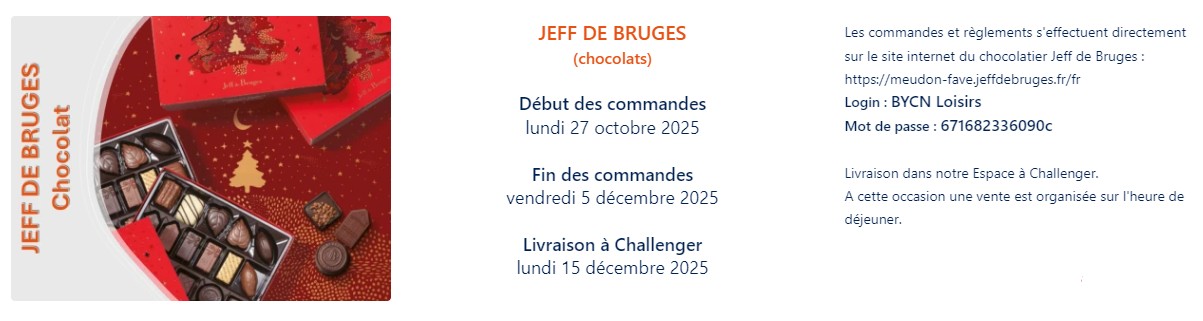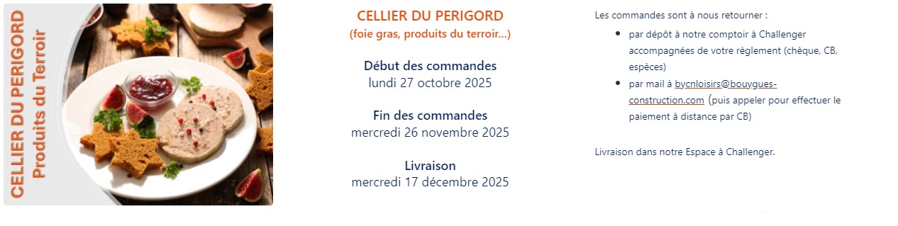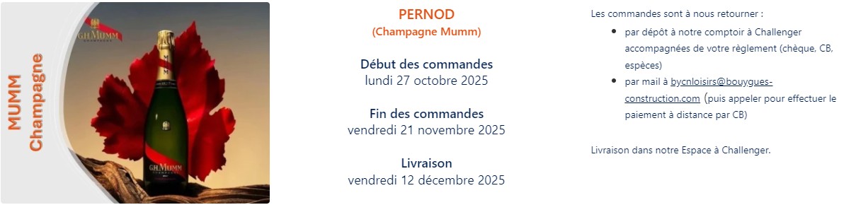A l’occasion des fêtes de fin d’année, BOUYGUES CONSTRUCTION LOISIRS nous propose des offres avec ses partenaires (en commandes groupées afin de bénéficier de remises) sur nos achats de chocolat, foie gras, saumon et champagne ! Si vous êtes intéressés: